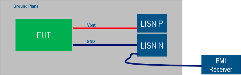 传导发射(CE)测试包含对线路中的电流或线路阻抗稳定网络(LISN)中端口电压的测量。在汽车领域,测试装置由被测设备(EUT)、电线、LISN、电磁干扰(EMI)接收器、CAN等通信设备、负载(若需要)以及接地层组成,接地层代表汽车底盘和电压参考。