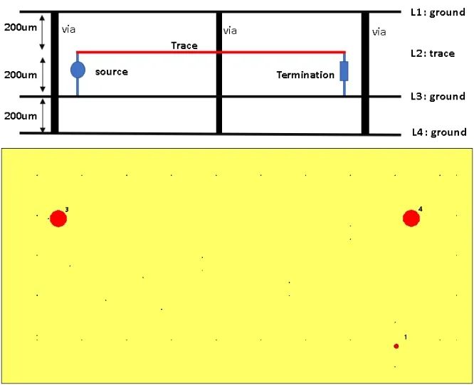 案例2包含一个4层PCB,而激励走线位于两个用于传播信号的实心PCB参考层之间(参见图3)。