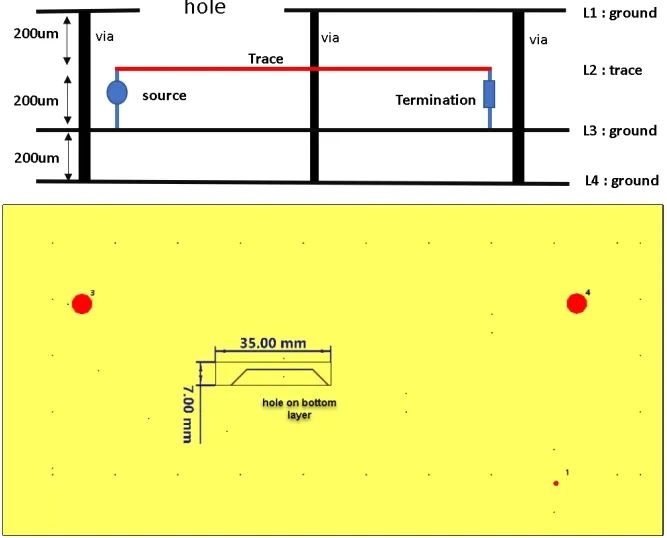 案例3与案例2相同,不过走线正下方底层有一个小孔(参见图4)。