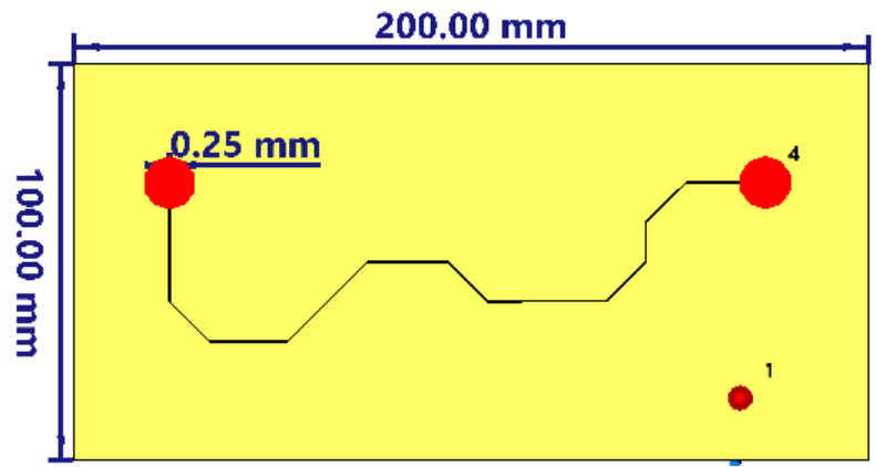 PCB为矩形,尺寸为21厘米*10厘米,而走线长度为21厘米,线走宽度为0.25毫米,如图5所示。