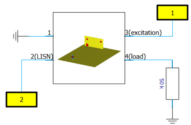相关配置是根据连接到我们希望分析的每个端口的阻抗与组件单独进行定义的。也就是说,我们可以在无需重复求解3D模型的情况下修改终端与驱动值并获取LISN电压。这样可以显著缩短仿真时间。另外,在协同仿真设计流程中,我们可以在考虑所有驱动与终端电路的情况下利用“合并结果”功能来计算3D模型中的电流与电磁场。这种可视化功能对于开展研究非常实用。其可以深入分析每个仿真配置的耦合过程。所研究的电路很简单,如图7所示。