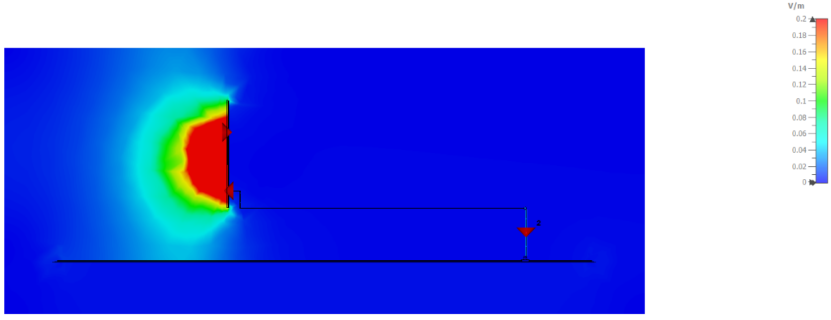 走线由来自缓冲器或微控制器的信号激发,并由固定阻抗终止。它对时钟或具有某些高频分量的通信信号进行建模。在仿真过程中,激励是处于100kHz~300MHz频段的宽带电压源。终端是一个50kΩ的电阻。对于所研究的频段,终端阻抗的精确值无关紧要,不过其具有足够高的值,以便使电容耦合占据更加主导的作用。