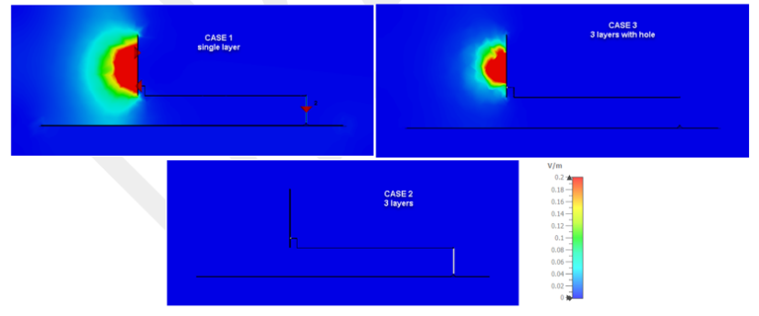 案例2与案例3被简化为三层而非四层。事实上,L4经过抑制可以简化相关模型,同时降低相关结果的解释难度。因为L3和L4之间不存在噪声源,并且它们之间可能存在的电压可以忽略,所以这种简化并不影响最终结果。此外,接地层也可以成为通过去耦电容器连接的电源层。在我们的案例中,电容器被视为理想器件,并且各层通过多个过孔相互连接,以确保它们之间具有最小阻抗。因此,三层的PCB模型可以代表完整的四层系统。